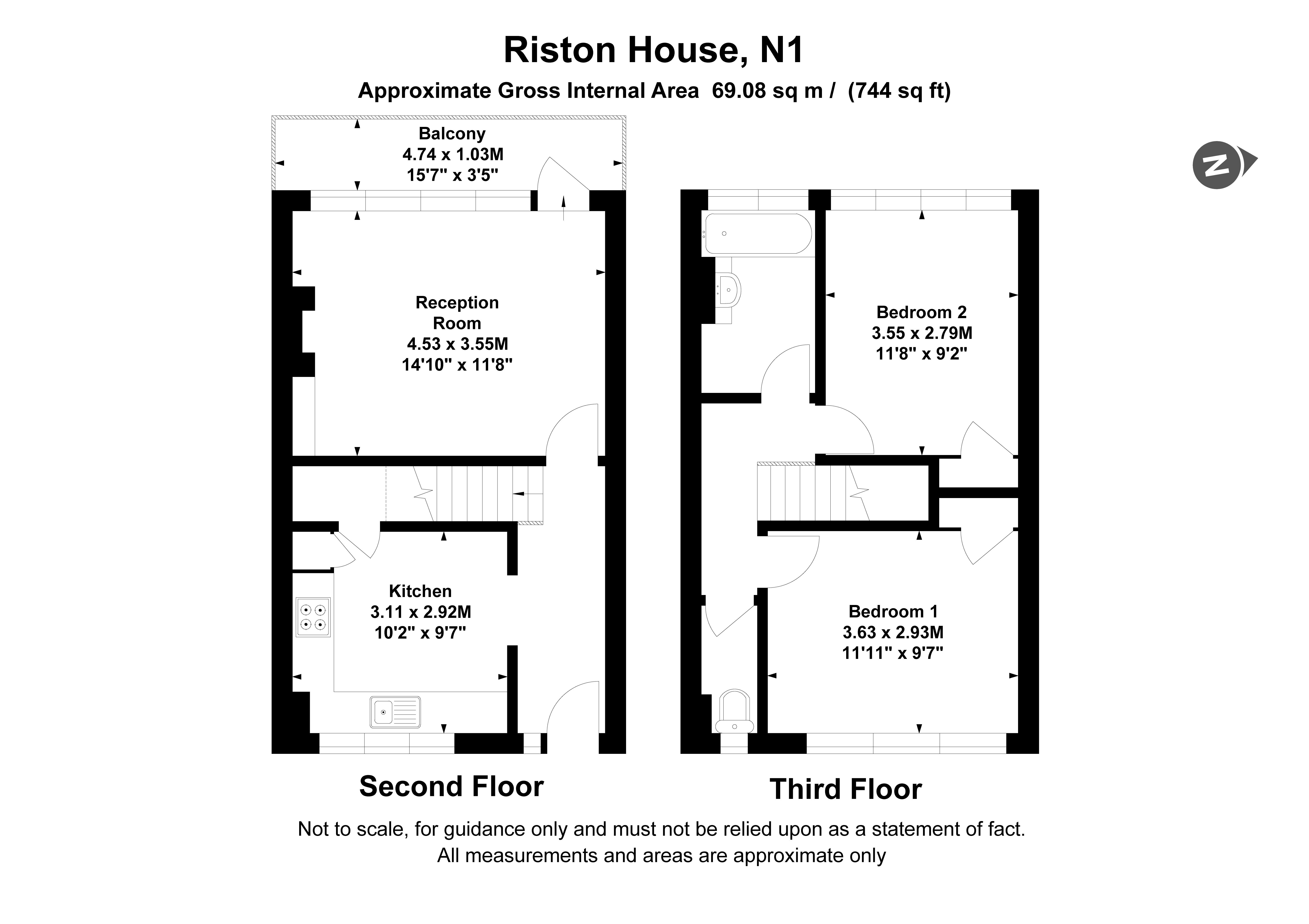 A two‑bedroom split‑level flat extending to approximately 744 sqft, arranged over the second and third floors.